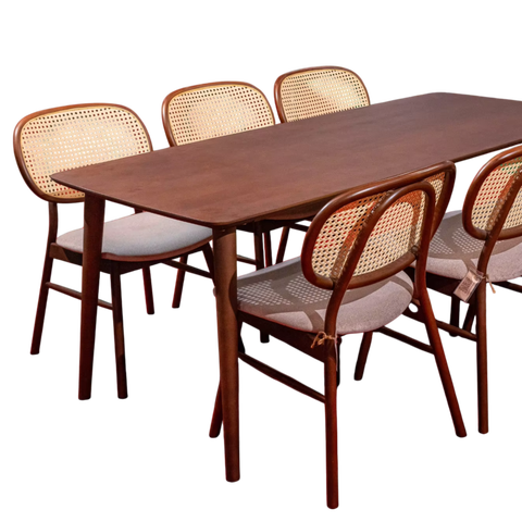 木製ダイニングセット6つの杖椅子と織りラタンクッションシート