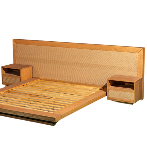 木織ロープ装飾ヘッドボード付きモダン和風木製ベッド